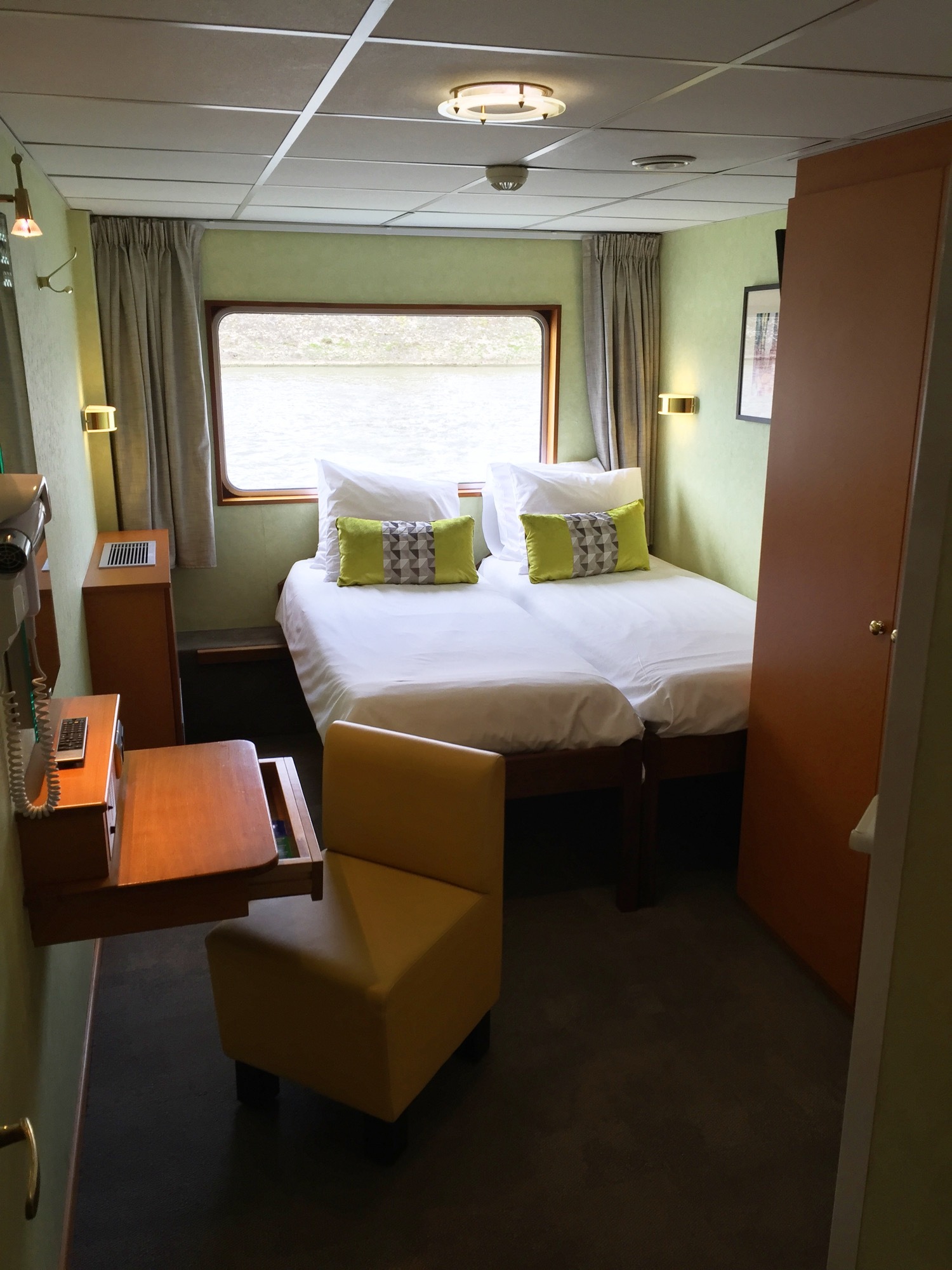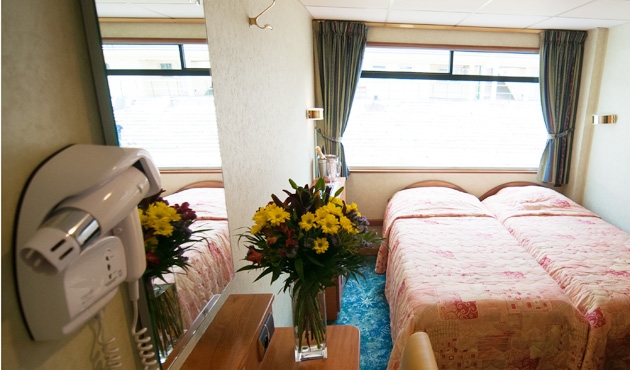 The double, single and twin cabins all offer guests the perfect view from their large picture window, and are very spacious and tastefully decorated with the option of double or single beds. An ensuite is provided with shower, W.C. and a hairdryer. For extra comfort central heating is available during the Winter season and air-conditioning for the Summer season.For your entertainment a satellite tv and radio are provided for you to use at your leisure.There is one cabin suitable for passengers with reduced mobility.