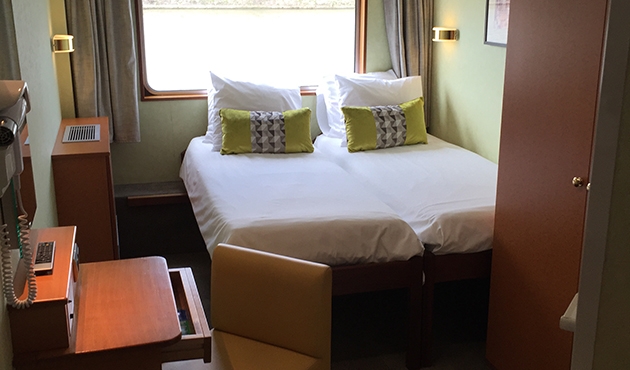 Comfortable cabin equipped with two beds that can be separated, private bathroom with shower and bath products, satellite TV, safe, hairdryer and radio. Located on the main deck with high window, it offers a panoramic view of the landscapes.