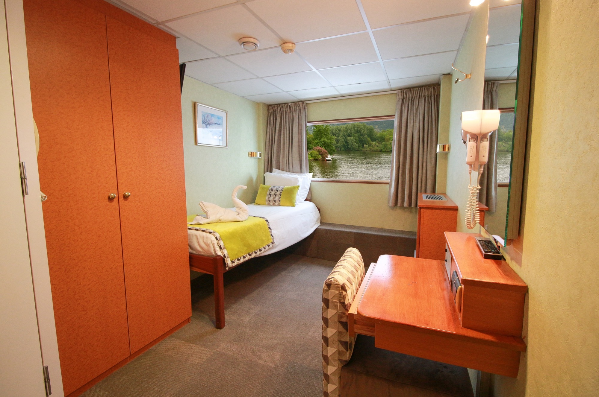 Comfortable cabin equipped with one single bed, private bathroom with shower and bath products, satellite TV, safe, hairdryer and radio. Located on the main deck with high window, it offers a panoramic view of the landscapes.