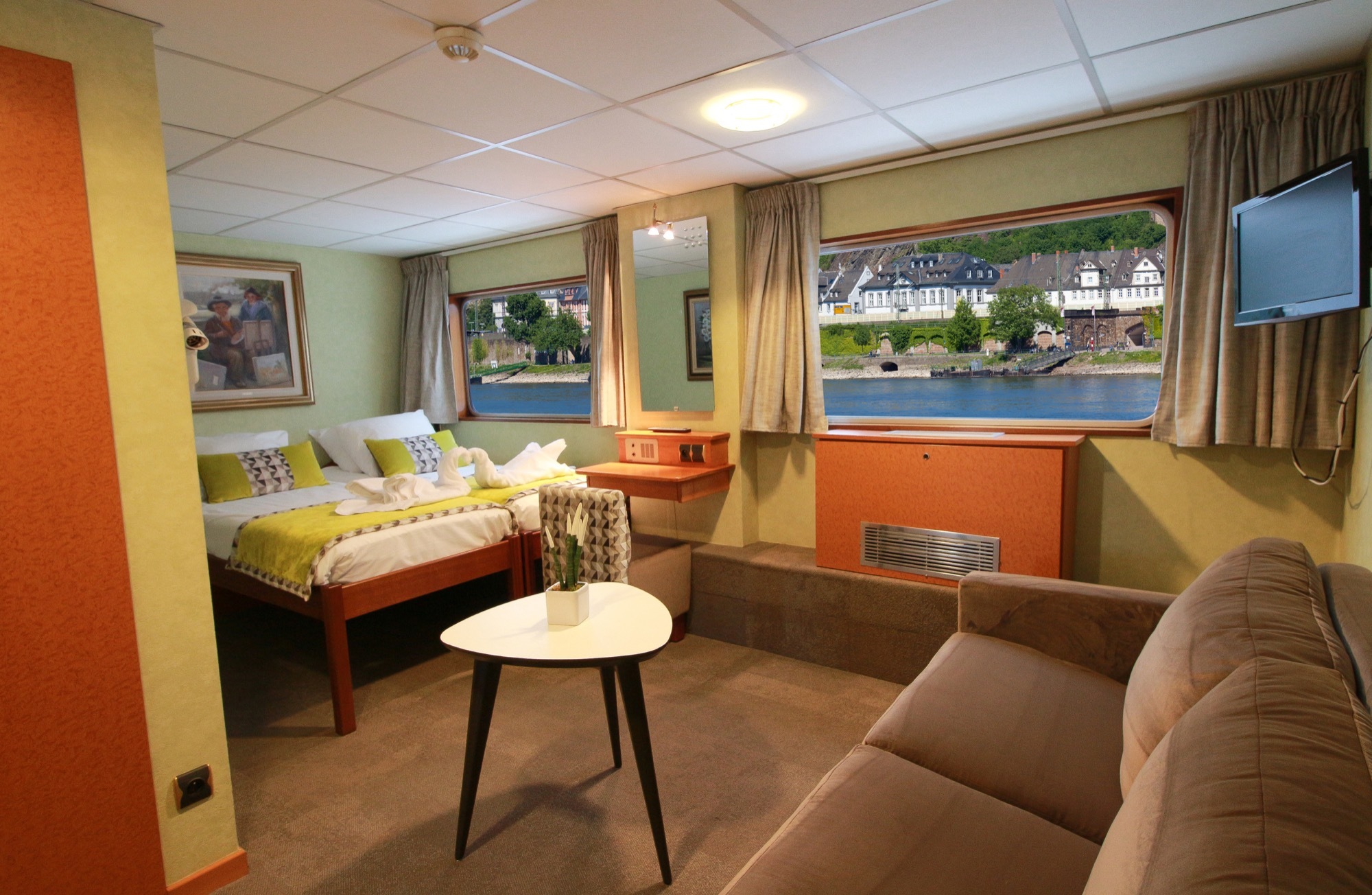 Comfortable cabin equipped to welcome up to 3 passengers (1 bed and bunk beds), private bathroom with shower and bath products, satellite TV, safe, hairdryer and radio. Located on the main deck with high window, it offers a panoramic view of the landscapes.